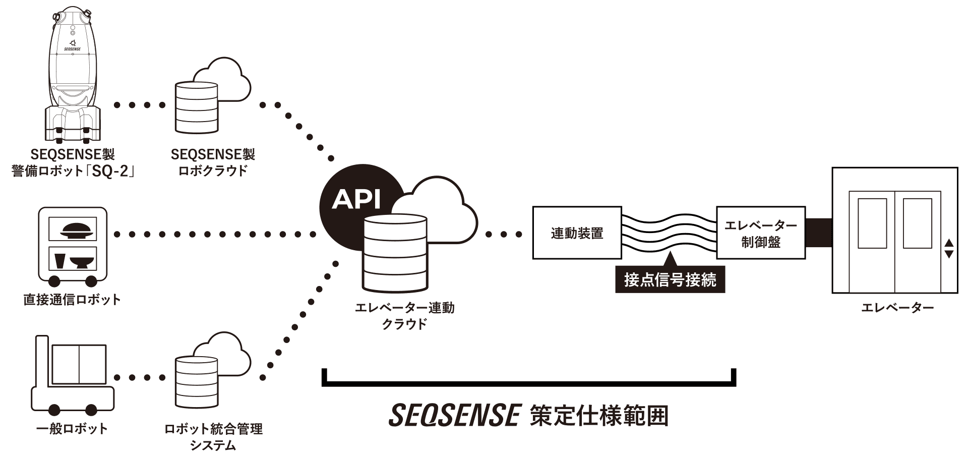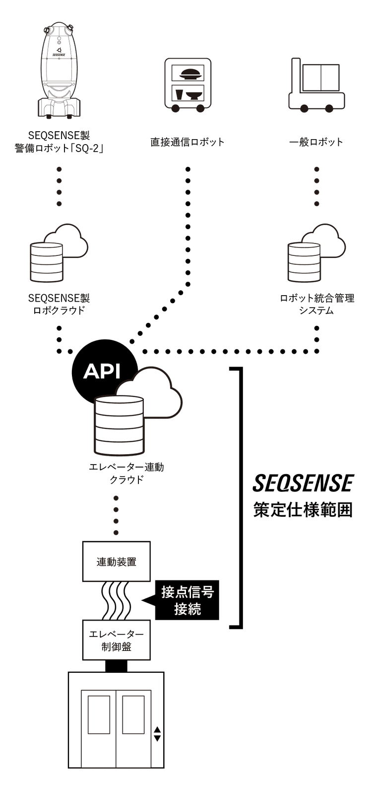 この仕様は、エレベーター制御盤との通信を⾏う無電圧接点信号の仕様、ロボットと通信するためのクラウドAPIの仕様、そしてこのプラットフォームを利⽤するために必要なロボットに求められる要件によって構成されています。